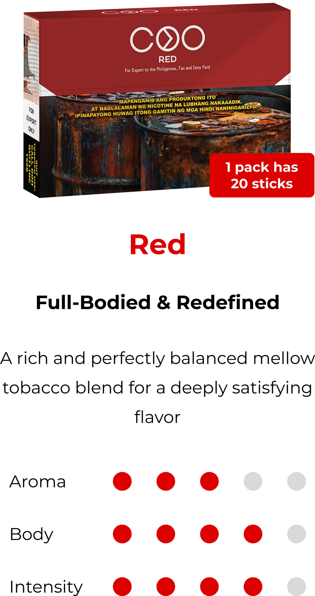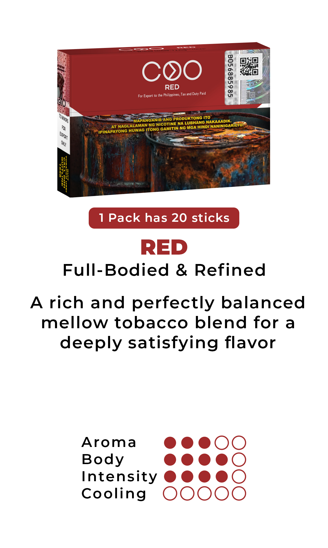 COO is specially designed heat-not-burn tobacco sticks. Each COO stick contains real tobacco leaves formulated to provide a highly satisfying flavor pay-off, richer bolder aromas, and authentic tobacco flavors.